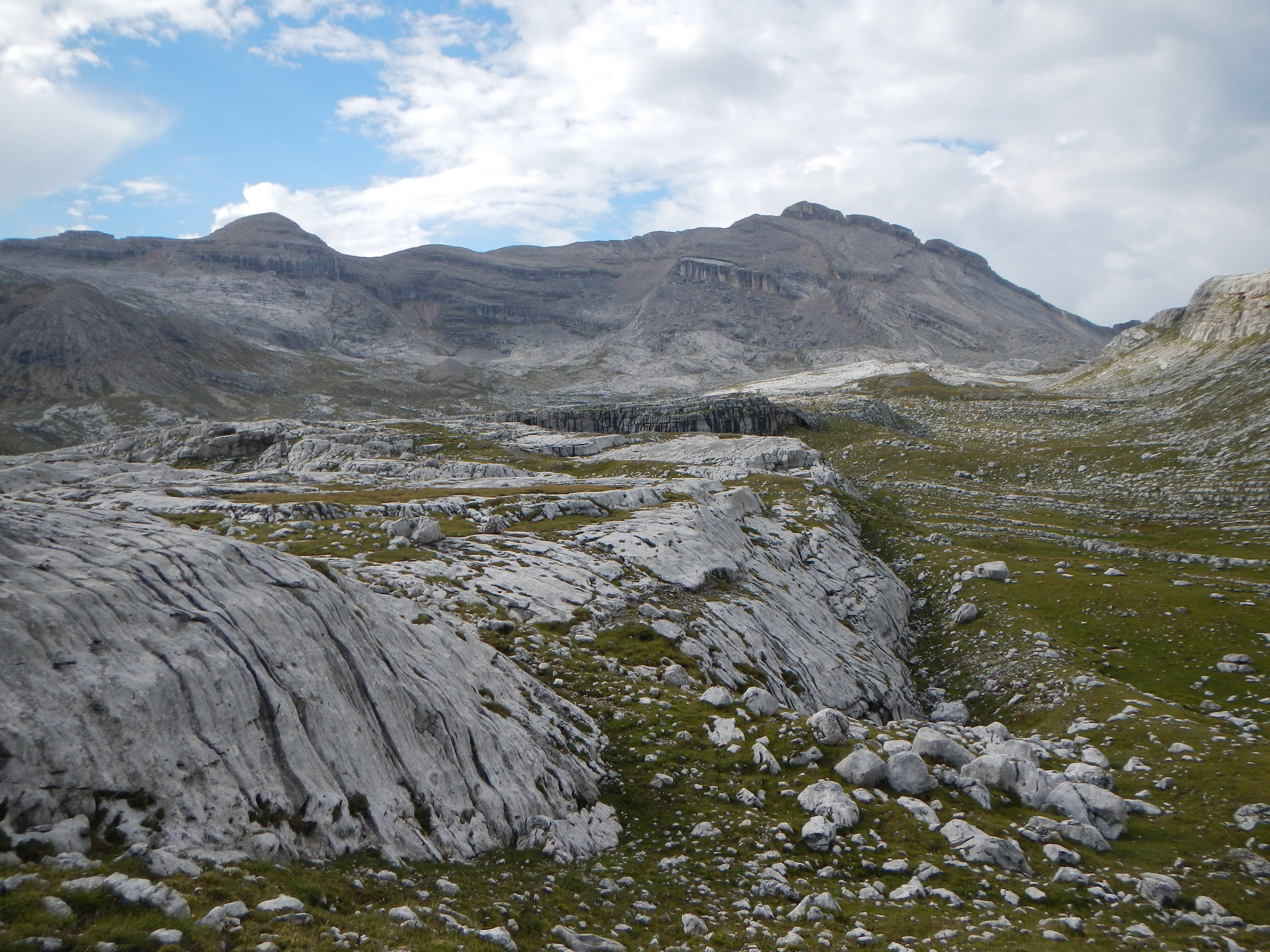Und gelegentlich fibt es ein paar Steilstufen. Hinten links der Heiligkreuzkofel und links die Zehnerspitze.