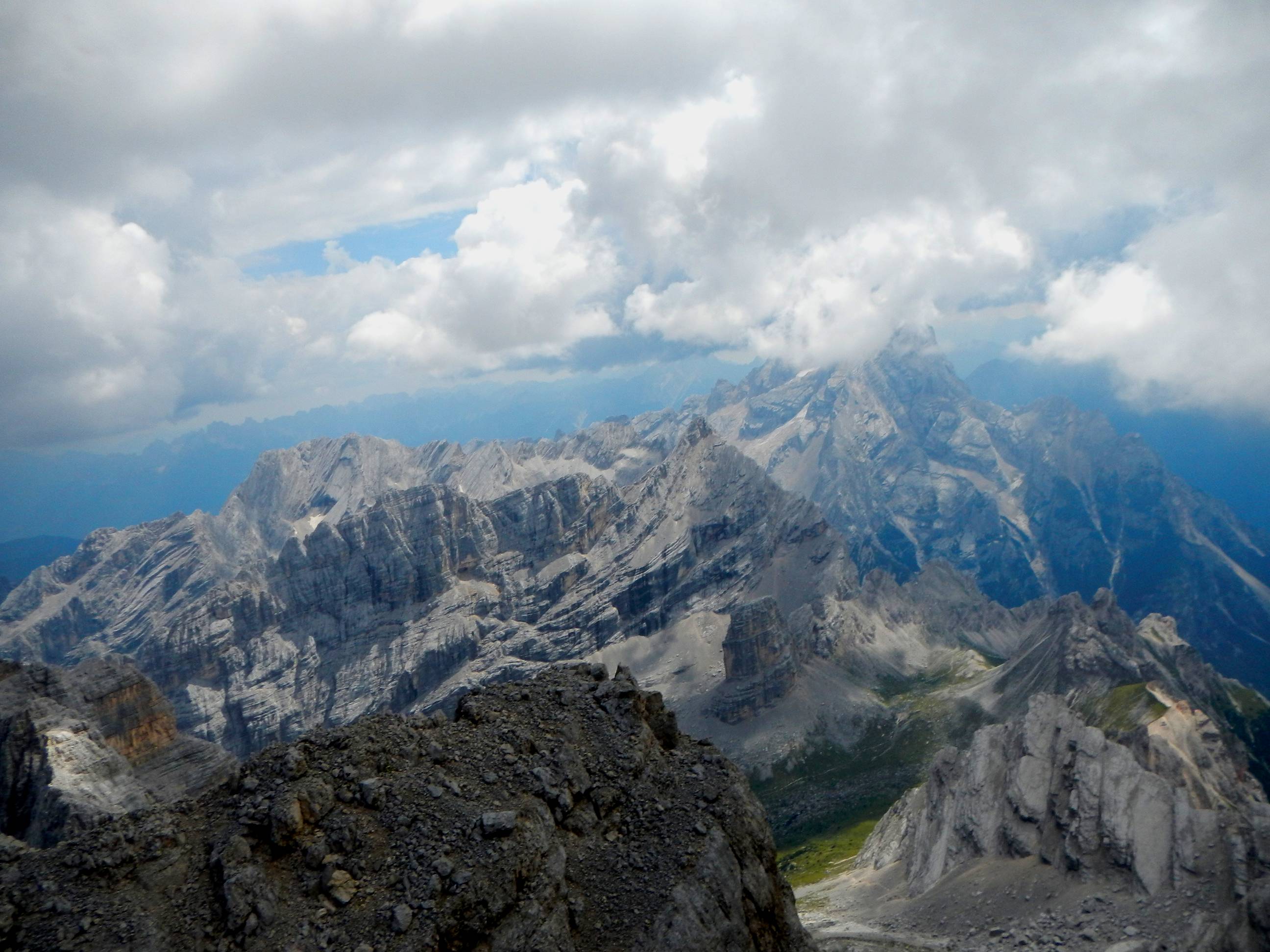 Der Antelao hat sich ein paar Wolken eingefangen. Unten rechts sieht man die Forcella Grande.