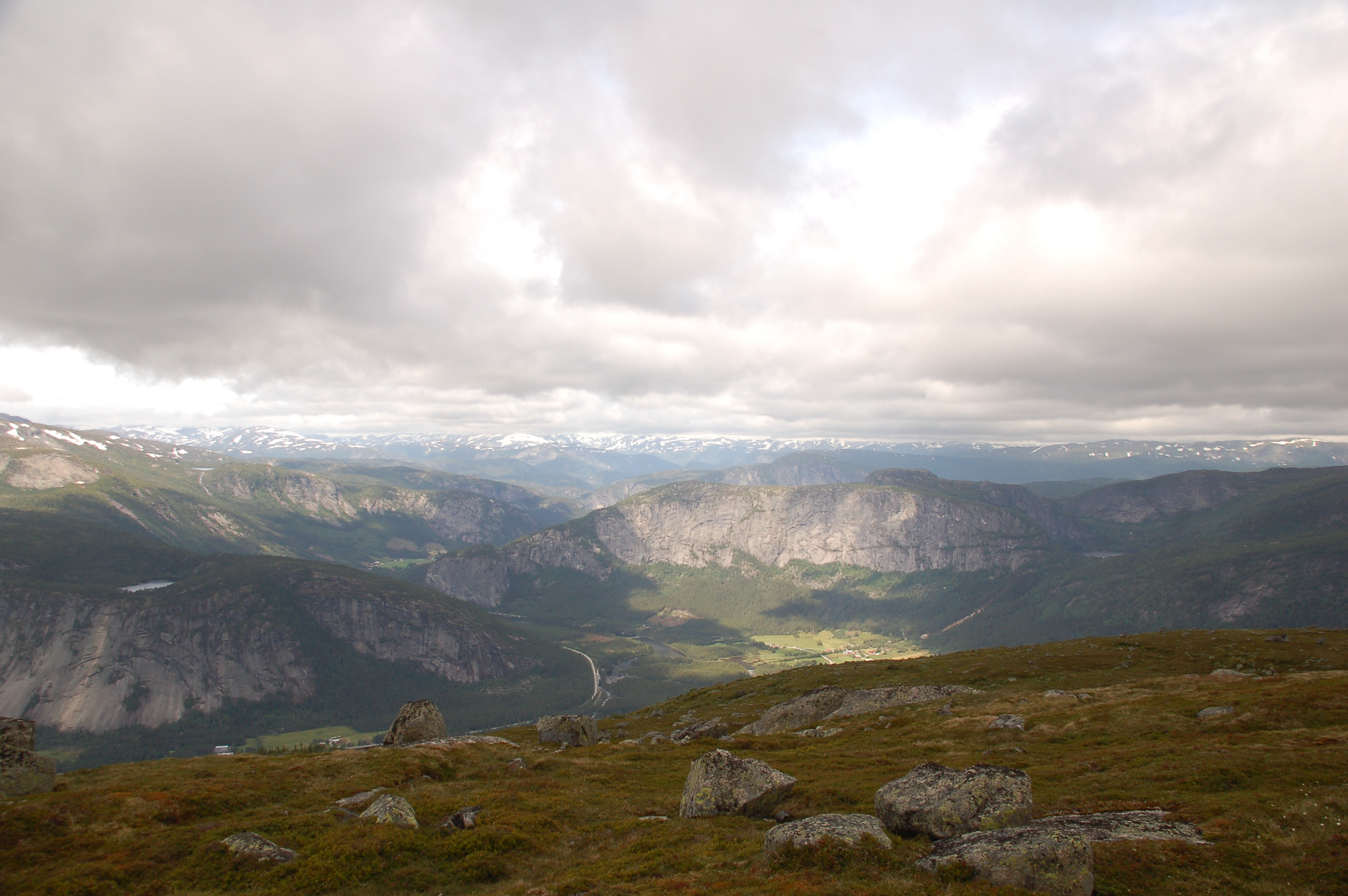 Nochmal ohne Jörg: Panorama der Felswände rund um Valle. Nomelandsveggen links und Homfjell in der Mitte.