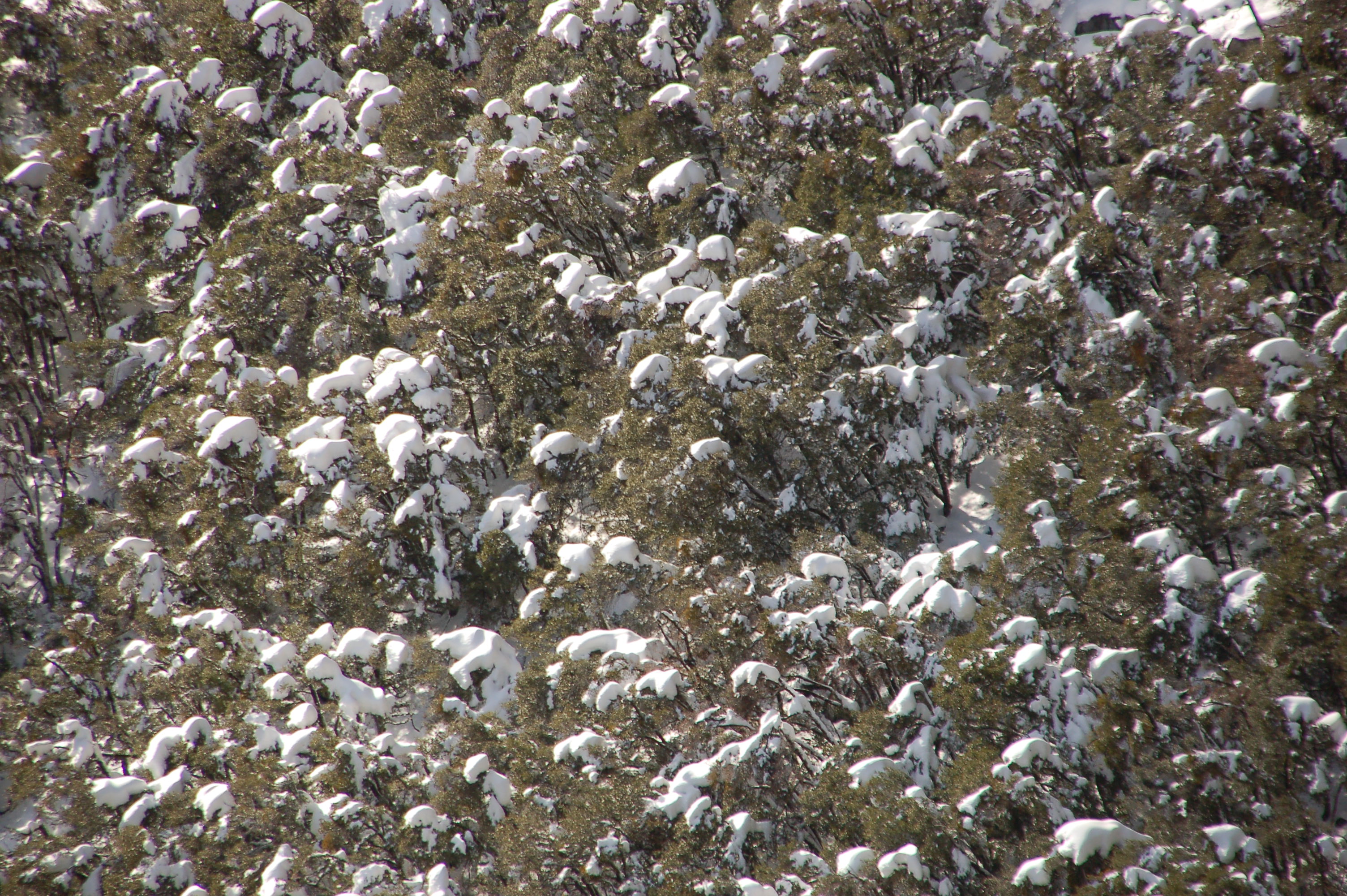 Viele große Bäume mit schlumpfigen Schneemützen.