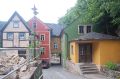 So sieht es da aus, kommen wir auf die Sachsen zu sprechen. Das sind gastfreundliche Menschen und wenn man weiß wo, kann man auch noch für 3.50€ eine Selbstversorger-Übernachtung bekommen. Nein, nicht im Sandstein. Sondern in einem echten Haus. In einem kleinen malerischen Dorf, das in ein enges Seitental der Elbe gezwängt ist. So stark gezwängt, daß sie die bunten Häuser sogar quer über die Straße gebaut haben.